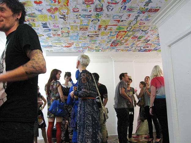 Anthony Jigalin’s prolific output of pencil, biro, guache on A4 paper installed on the ceiling of the Level 1 upstairs space had a sense of transience as much as Conor’s had a sense of groundedness and permanence. Anthony’s subjects from trains, to draculas, to fast cars and nudes were tacked to the ceiling with dressmaking pins. The installation took about 6 hours and this fragile “hanging garden of line and colour” changed the sense of space in the gallery and had viewers on the carpet for some relaxed viewing. The vibrancy and quick draw aspect of this show belies the passion Anthony has for his art and this contribution to visual story telling at Jugglers has made its mark on us. Keep going Anthony! Peter Breen,Director, Jugglers Art Space Inc.
